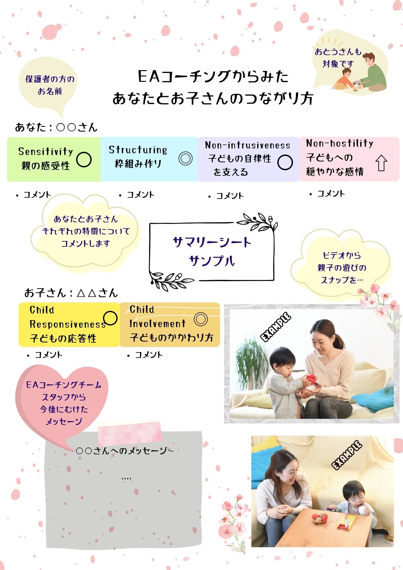 2回目のEAコーチングの際、口頭でのフィードバックとともに簡単なサマリーシートを作成してお渡しいたします。サマリーシートのサンプルはこちらです。