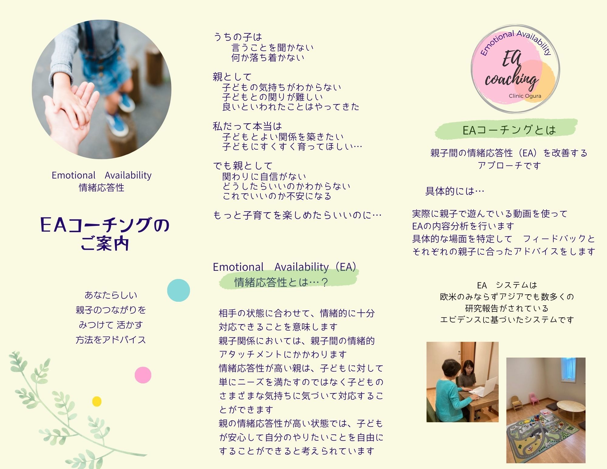 親御さんが、お子さんの特徴に合わせたかかわり方を理解することで、お子さんのニーズに応えながら、発達促進的なかかわり方ができるようになります。EAコーチングのトレーニングを受けた心理士が、ビデオの内容分析に基づいて、アドバイスをします。